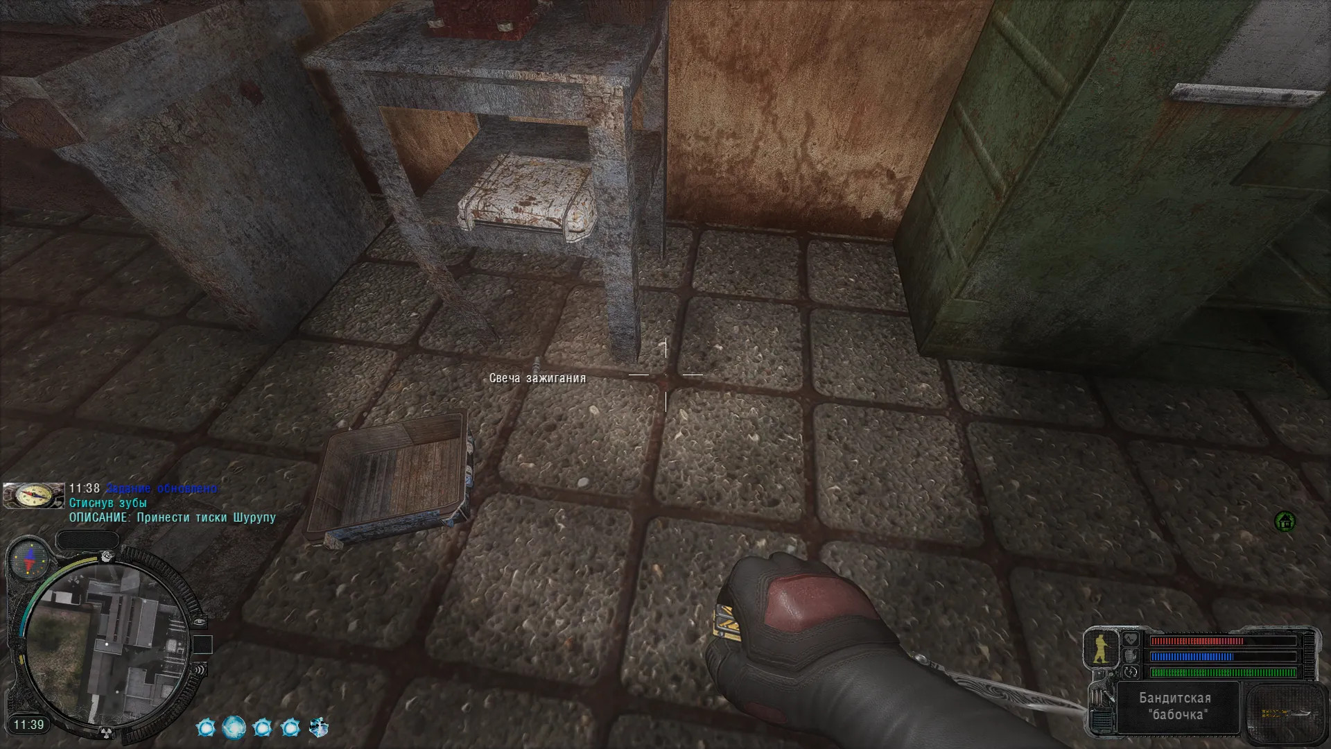При первом посещении Х-18 мы найдем там неработающий генератор. Для починки нам нужна свеча зажигания. Находим ее в мастерской Бандитов в Тёмной Долине. Свеча лежит в разбиваемом металлическом ящике